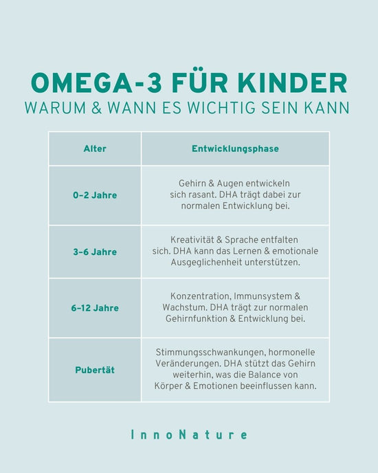 Kinder haben besondere Bedürfnisse, denn es geht um nichts weniger als das gesunde Aufwachsen. Omega 3 spielt hier eine besondere Rolle und begleitet Kinder durch alle Phasen der Entwicklung. Vom Gehirnwachstum über das Immunsystem bis hin zur Konzentrationsfähigkeit.