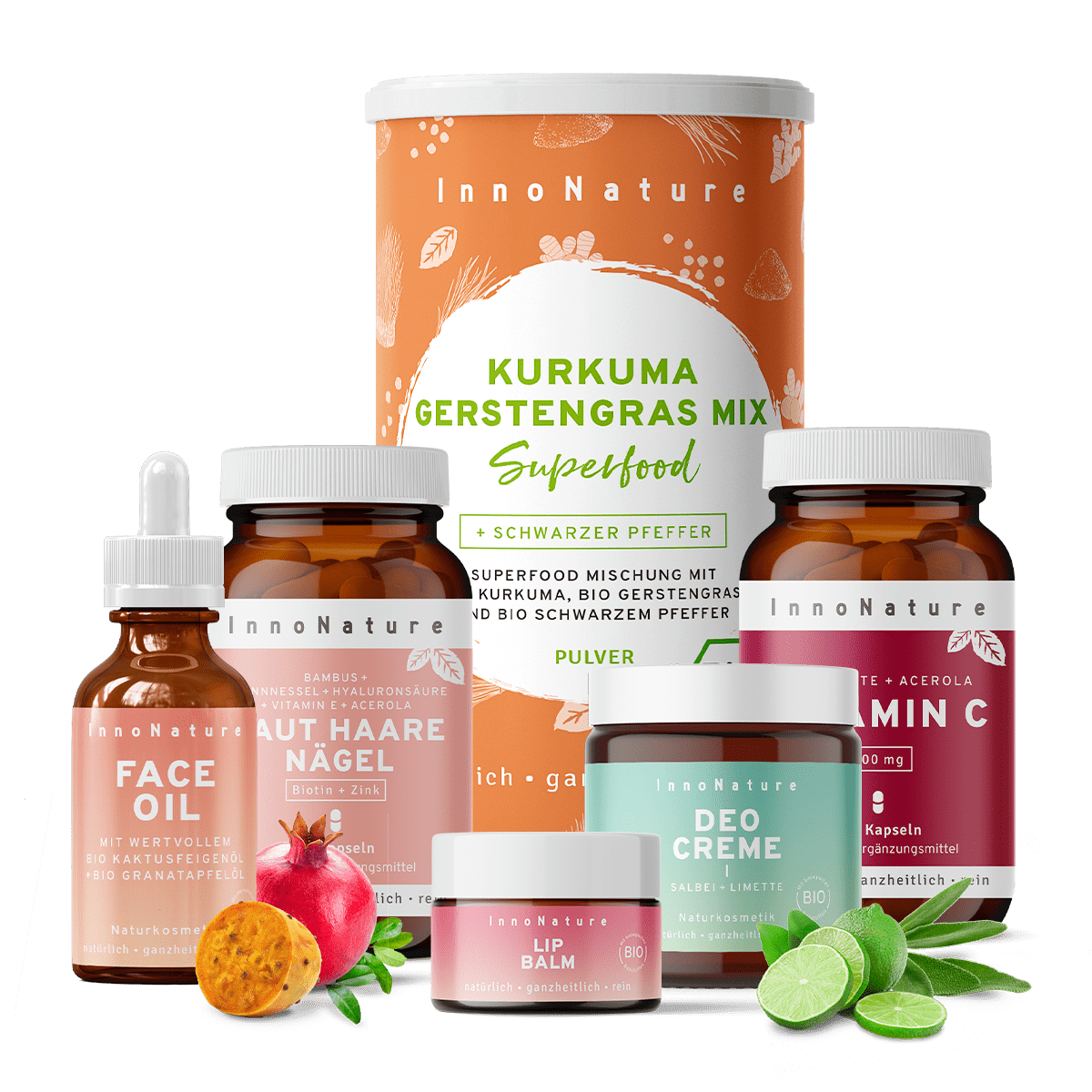 ✔ Hochwirksame Kombination aus Haut Haare Nägel Kapseln, Vitamin C, Kurkuma Gerstengras, Bio Face Oil, natürlich Deocreme und unserem Soft Glow Lip Balm