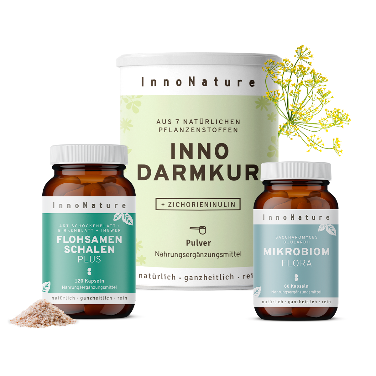 Dieses Paket beinhaltet eine optimale Kombination aus der Inno Darmkur, Mikrobiom Flora und Flohsamenschalen Plus. Zusammen bilden sie ein unschlagbares Team für Deinen Körper.