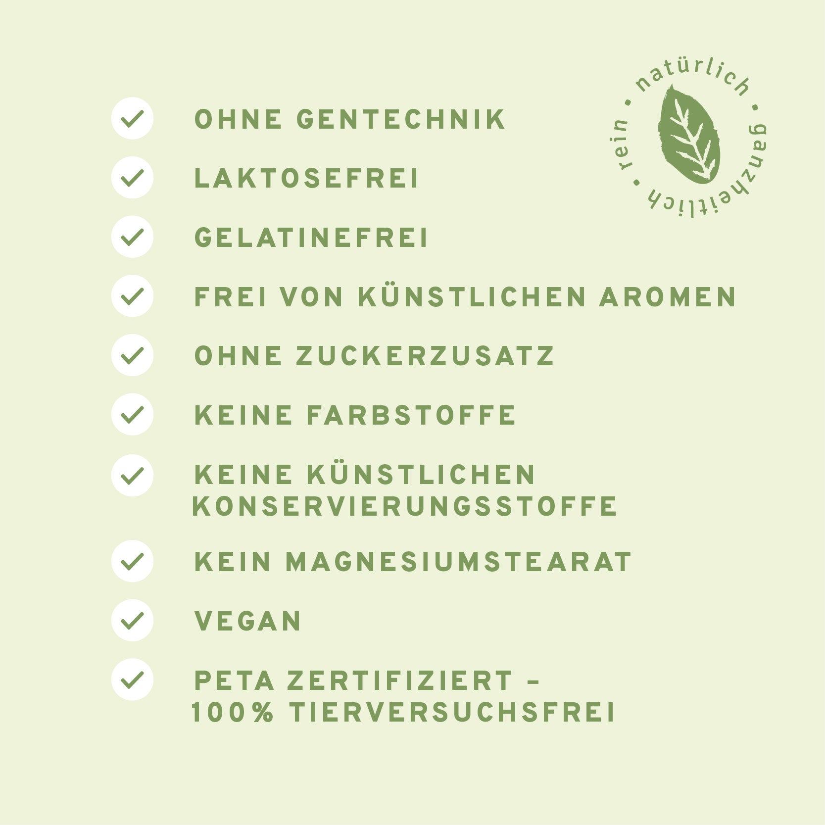 💛 NATÜRLICH, GANZHEITLICH, REIN: frei von überflüssigen Zusatzstoffen und Zutaten. Laktosefrei, ohne Zuckerzusätze, keine Farbstoffe, ohne Zusatz von Aromen, keine Magnesiumstearat und ohne Gentechnik.