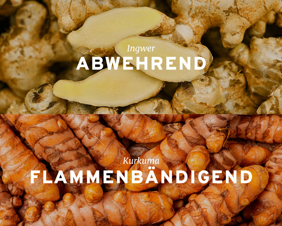 Der Flammenbändiger – Dieses goldgelbe Gewürz ist seit Jahrhunderten ein fester Bestandteil der traditionellen Erfahrungskunde. Besonders bekannt ist Kurkuma für seine ihm nachgesagten entzündungshemmenden Eigenschaften. Viele Menschen setzen auf Kurkuma, um inneres Feuer zu beruhigen. Sein Hauptwirkstoff, das Curcumin, soll zusätzlich das Immunsystem und die Gelenke unterstützen. Piperin aus dem schwarzen Pfeffer gilt weit verbreitet als die perfekte Ergänzung für Kurkuma.