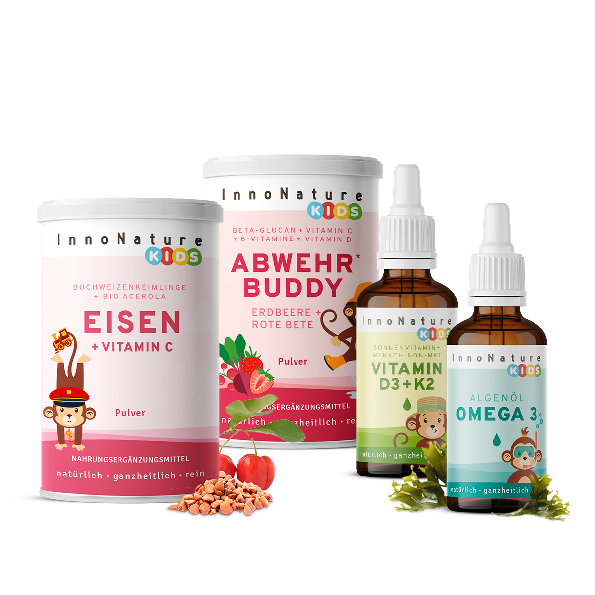 Dieses Paket beinhaltet eine hochwirksame Kombination aus Omega 3 Kids, Vitamin D3+K2 Kids, Eisen Kids und Abwehr* Buddy Erdbeere + rote Bete. Zusammen bilden sie ein unschlagbares Team für das Immunsystem Deines Kindes*.