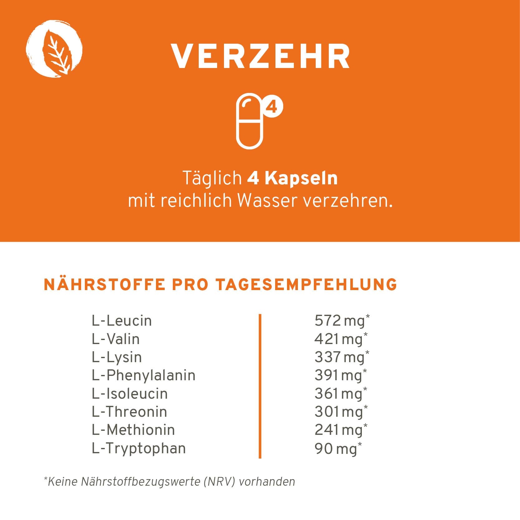 L-Leucin 18,4%*, L-Lysin HCL 13,6%*, L-Valin 13,6%*, L-Phenylalanin 12,6%*, L-Isoleucin 11,6 %*, L-Threonin 9,7 %*, L-Methionin 7,8 %*, Überzugsmittel: Hydroxypropylmethylcellulose (Kapselhülle), L-Tryptophan 2,9 %*