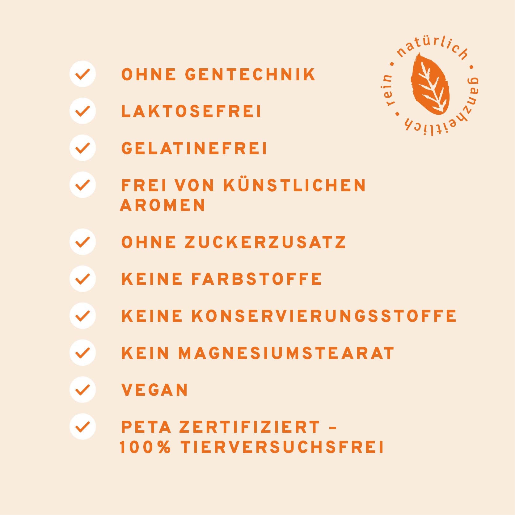 💛 NATÜRLICH, GANZHEITLICH, REIN: Frei von überflüssigen Zusatzstoffen und Zutaten. Laktosefrei, ohne Zuckerzusätze, keine Farbstoffe, ohne Zusatz von Aromen, frei von Füllstoffen, keine Konservierungsstoffe, kein Magnesiumstearat, ohne Gentechnik und allergenfrei.