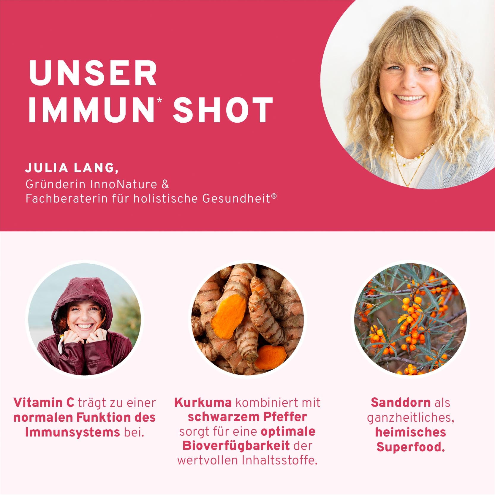 Unser Immun* Shot vereint sieben kraftvolle Zutaten aus der Natur – Zitrone, Apfel, Ingwer, Kurkuma, Sanddorn, schwarzer Pfeffer und Acerola – zu einer sorgfältig abgestimmten, rein pflanzlichen Rezeptur mit Vitamin C für Dein Immunsystem.