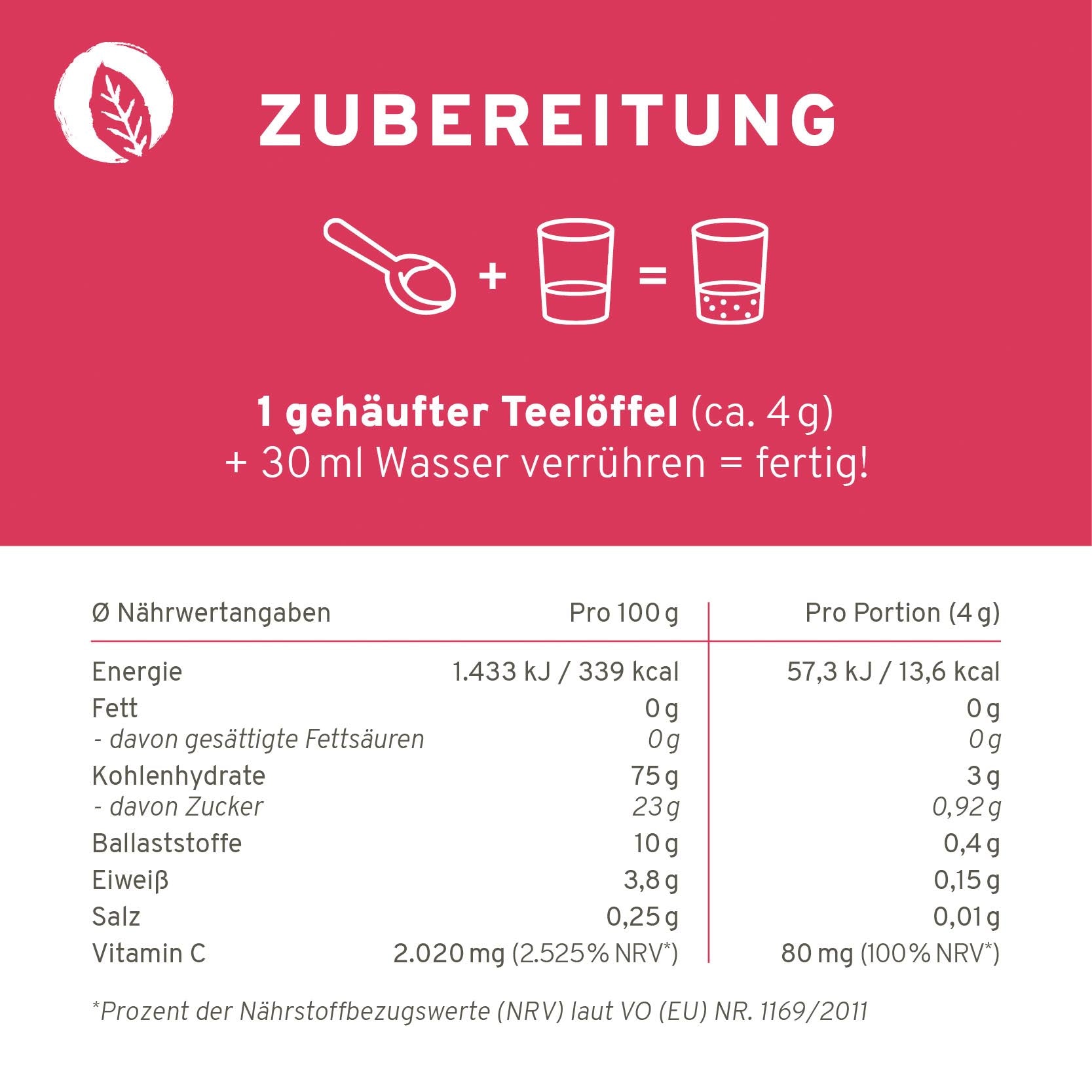 Eine Tagesdosis unseres Shots (4 g Pulver in ca. 30 ml Wasser) versorgt Dich mit 80 mg Vitamin C – das entspricht 100 % des empfohlenen Tagesbedarfs – ergänzt durch wertvolle sekundäre Pflanzenstoffe aus natürlichen Quellen.