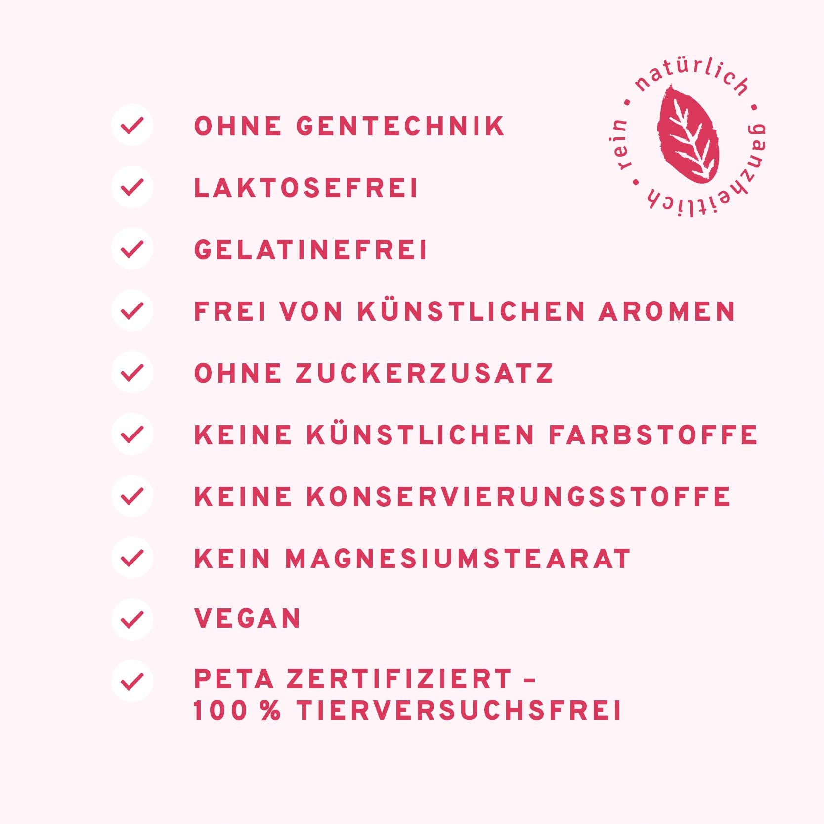 💛 NATÜRLICH, GANZHEITLICH, REIN: Frei von überflüssigen Zusatzstoffen und Zutaten. Ohne Konservierungsstoffe, laktosefrei, ohne Zuckerzusätze, keine künstlichen Farbstoffe, ohne Zusatz von künstlichen Aromen, kein Magnesiumstearat und ohne Gentechnik.