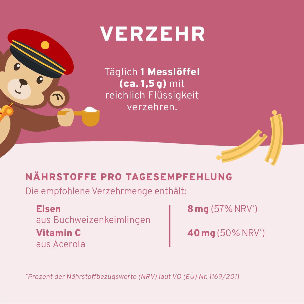 Eisen Kids Pulver: Natürliches Eisen aus Buchweizenkeimlingen und Vitamin C aus Bio Acerola