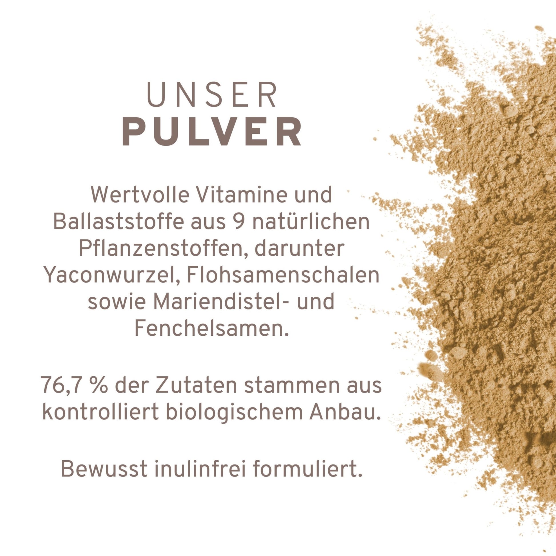 Zutaten: Bio Yaconwurzel Pulver 27,2 %**, Bio Akazienfaser Pulver**, Flohsamenschalen Pulver**, Bio Pflaumenfrucht Pulver**, Bio Bockshornkleesamen Pulver**, Bio Mariendistelsamen Pulver, Bio Acerola Extrakt**, Bio Fenchelsamen Pulver**, Buchweizenkeimlinge