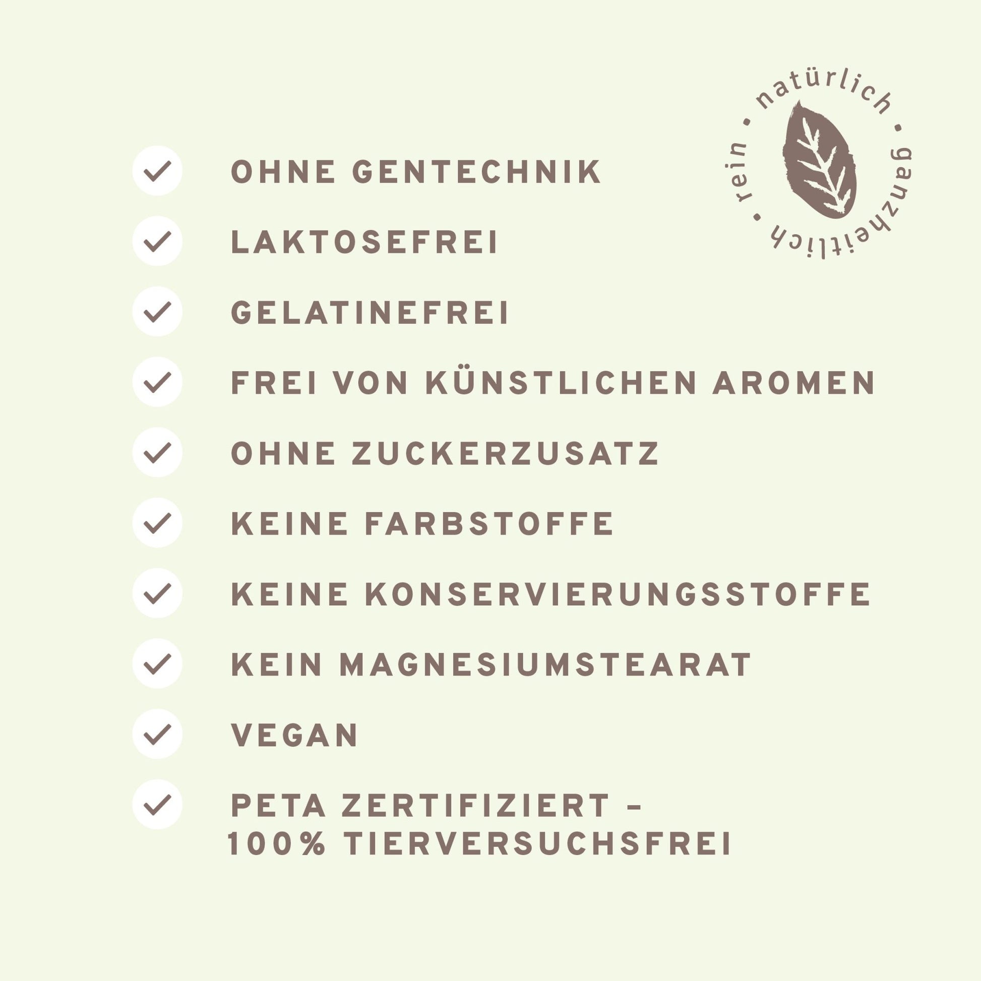 💛 NATÜRLICH, GANZHEITLICH, REIN: frei von überflüssigen Zusatzstoffen und Zutaten. Laktosefrei, ohne Zuckerzusätze, keine Farbstoffe, ohne Zusatz von Aromen, frei von Füllstoffen, keine Konservierungsstoffe, kein Magnesiumstearat, ohne Gentechnik.