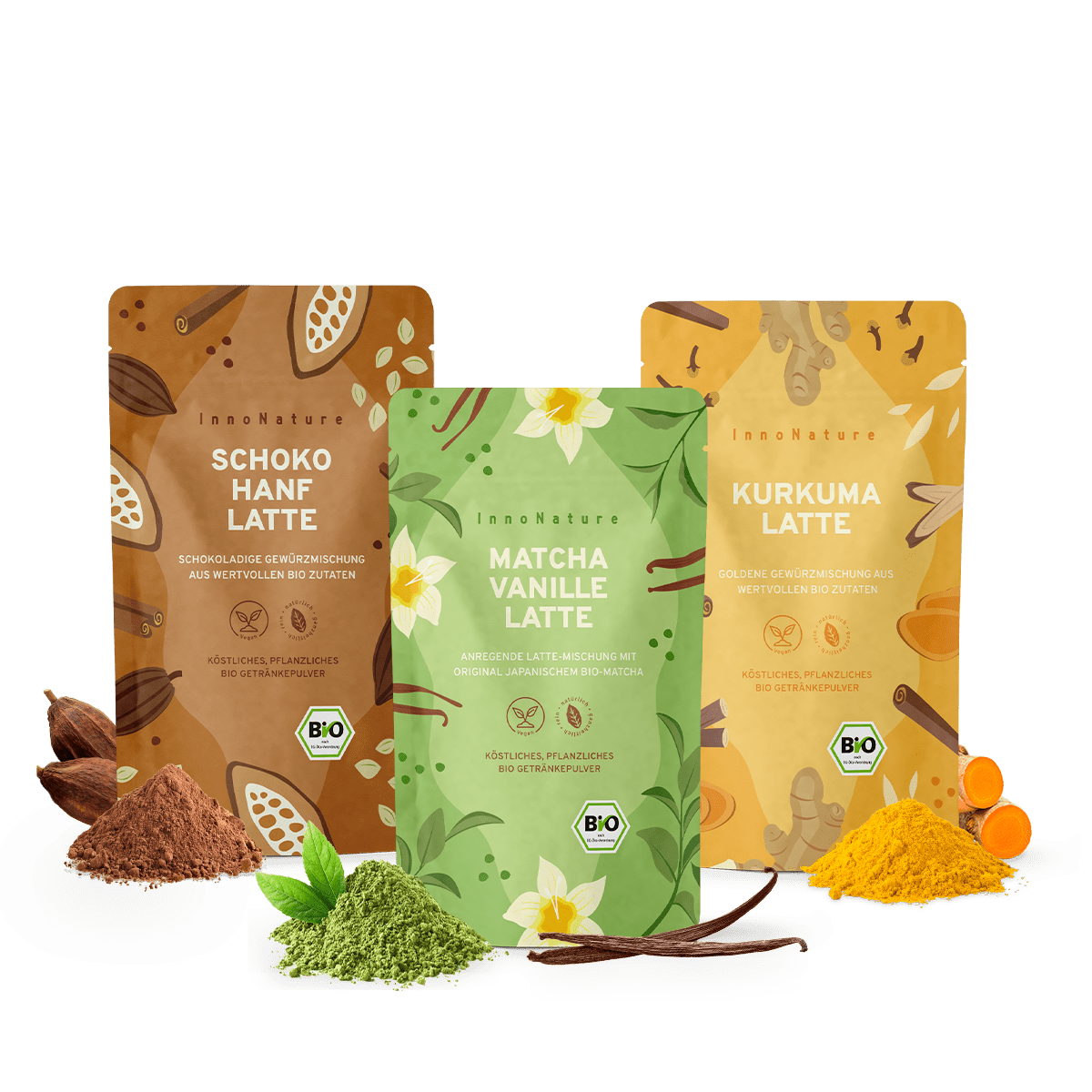 Das Latte-Love-Paket mit unseren drei Lieblings-Latte-Mischungen: Bio Kurkuma Latte, Bio Matcha Vanille Latte und Bio Schoko Hanf Latte.