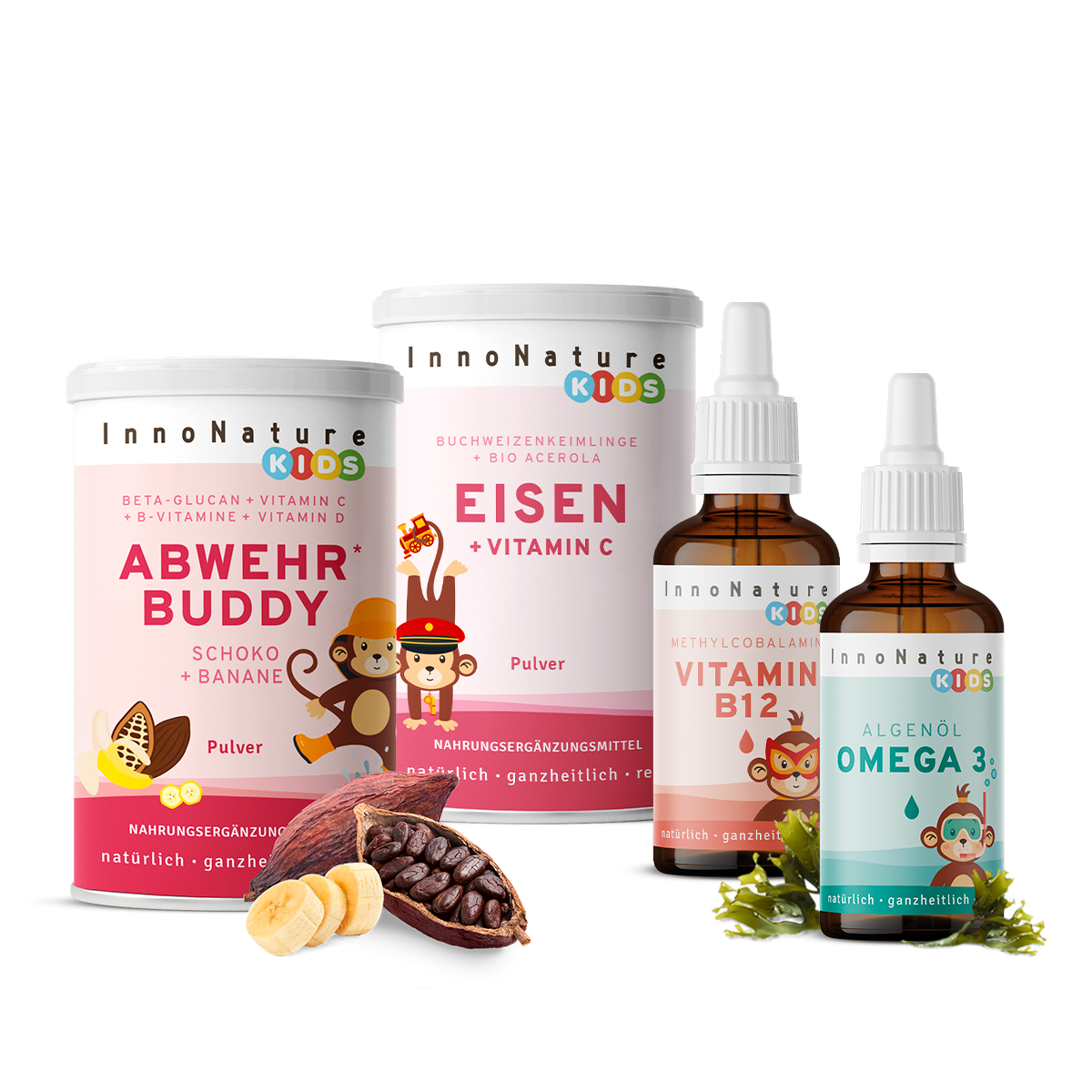 Dieses Paket beinhaltet eine durchdachte Kombination aus Omega 3 Kids, Eisen Kids, Abwehr* Buddy Schoko Banane und Vitamin B12 Kids. Zusammen bilden sie ein unschlagbares Team für die Psyche Deines Kindes*.