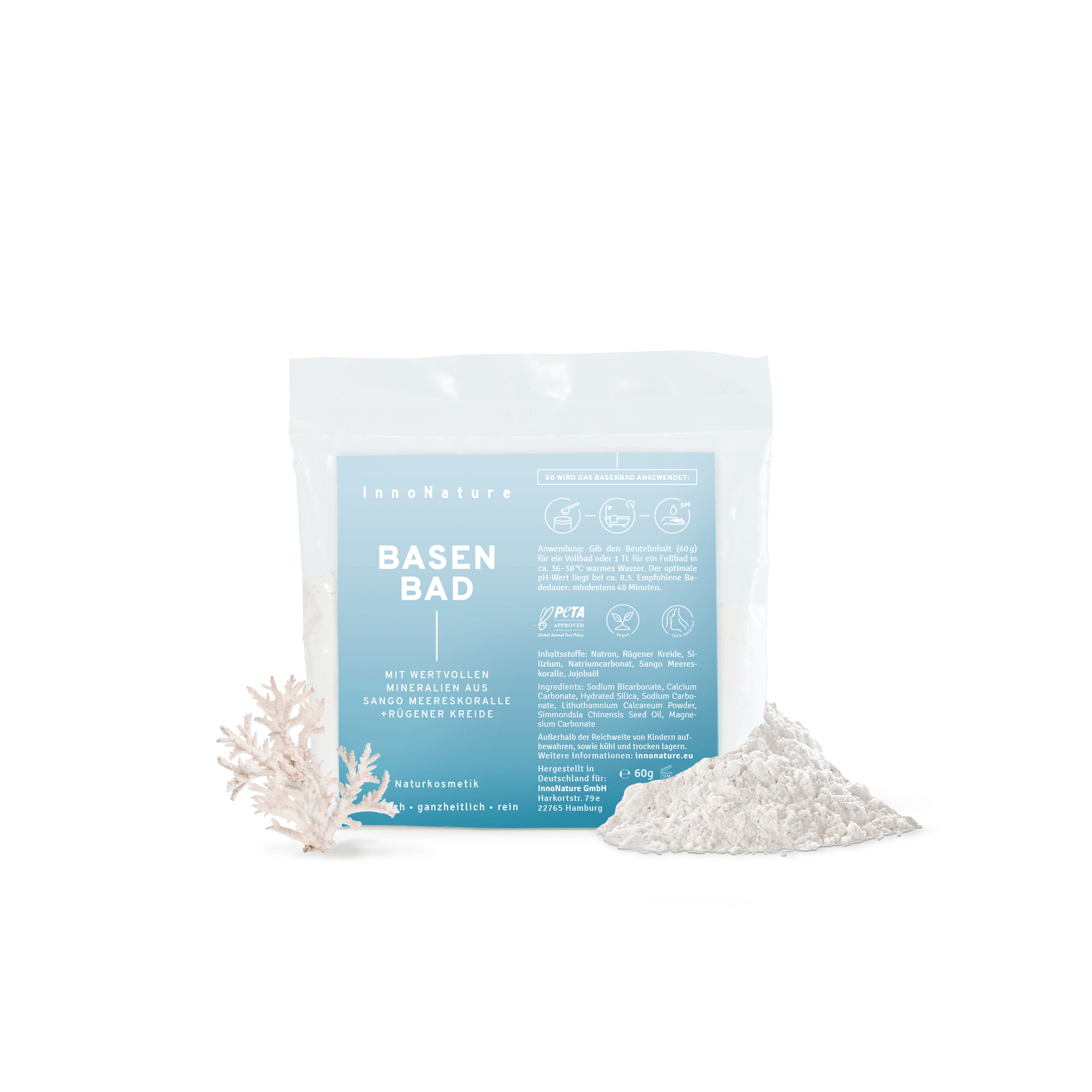 Das InnoNature Basenbad sorgt für einen pH-Wert von ca. 8,5, welcher die Haut dabei unterstützen kann, überschüssige Säuren an das Badewasser abzugeben. Durch die Sango Meereskoralle ist es besonders reich an Calcium und Magnesium, welche Deine Haut mit Mineralien versorgen. Abgerundet wird unser Basenbad durch die wertvolle Original Dreikronen Rügener Heilkreide®, welche nachgewiesen eine wohltuende und hautberuhigende Wirkung hat. Das InnoNature Basenbad eignet sich besonders gut begleitend zu einer Säure-Basen-Kur oder auch wöchentlich zur Entlastung des Stoffwechsels – Entspannungsmomente inklusive.
