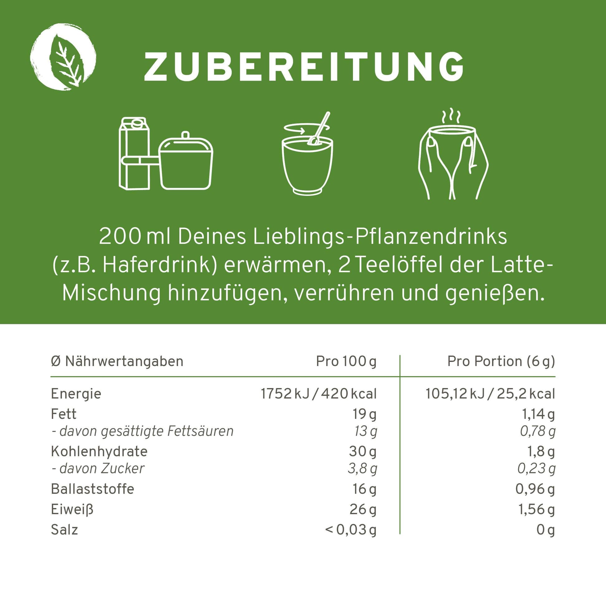Zubereitung: 200 ml Deines Lieblings-Pflanzendrinks erwärmen. Unsere Geschmacksempfehlung: Haferdrink. 2 Teelöffel (ca. 6 g) der Latte-Mischung hinzufügen und gut verrühren. Genießen und zwischendurch nochmal umrühren.