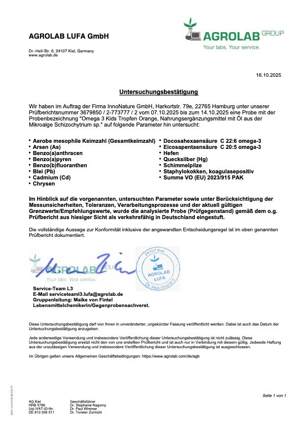 Wir freuen uns sehr, mit unseren Omega 3 Tropfen Kids Orange ein wirkungsvolles Produkt für Kinder gefunden zu haben, das auch wunderbar von Schwangeren und Stillenden in angepasster Dosierung verzehrt werden kann, sofern keine Unverträglichkeiten vorliegen. Dabei empfehlen wir eine Dosierung von maximal 30 Tropfen/ Tag.
