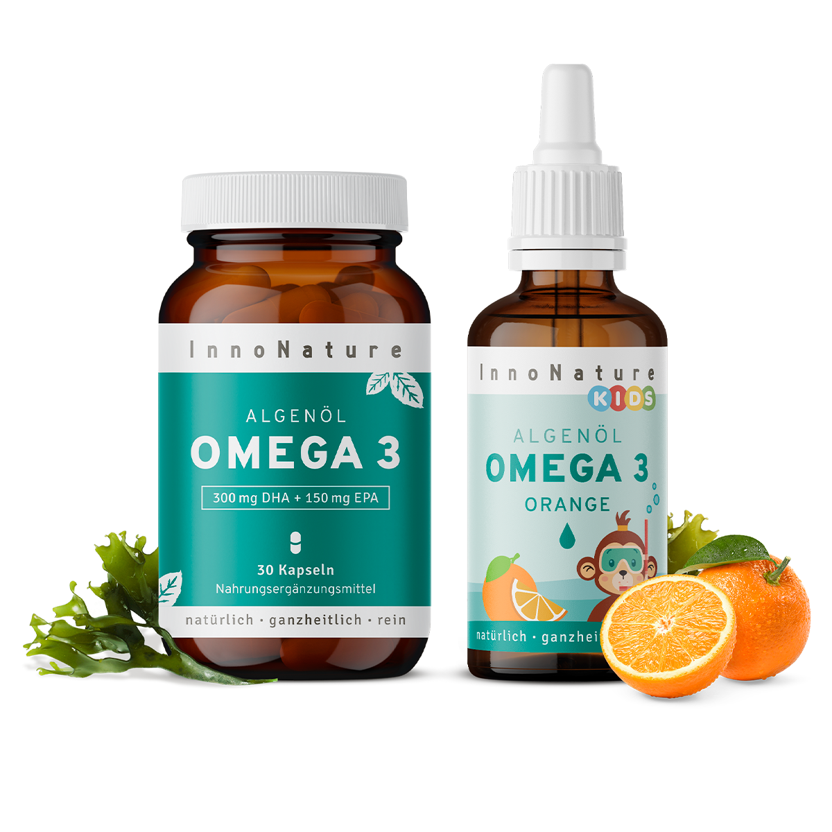 Dieses Set beinhaltet unsere Omega 3 2:1 DHA/EPA Kapseln für Erwachsene und unsere Omega 3 Tropfen Kids Orange für Kinder.