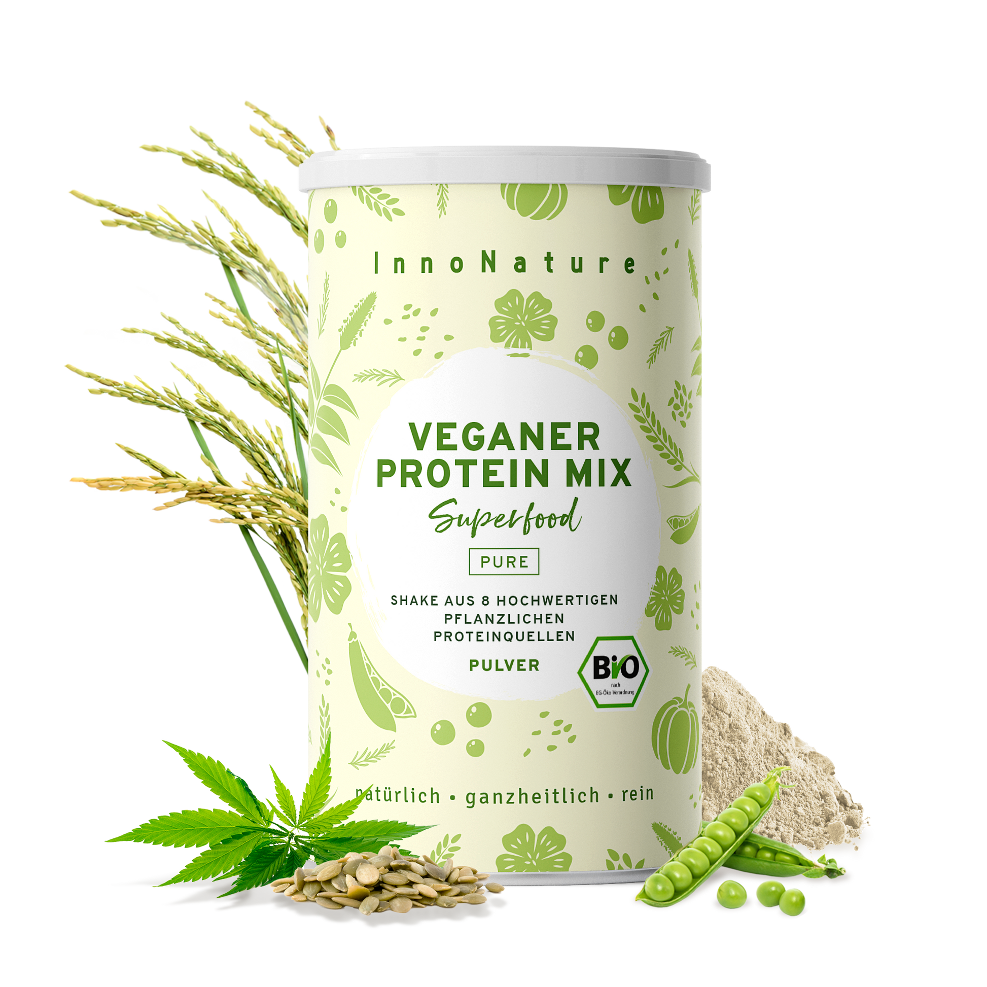 Protein ist einer der wichtigsten Energielieferanten und gleichzeitig ist es Grundbaustein für Muskeln, Organe und Blut. Und deshalb ist Protein nicht nur wichtig für Sportler*innen! Wir alle sind auf eine ausreichende Zufuhr angewiesen. Wer dem Körper eine besondere Freude bereiten möchte, achtet bei den Proteinquellen auf Abwechslung. Unser rein pflanzlicher Protein Mix Pure ist hier die optimale Lösung !