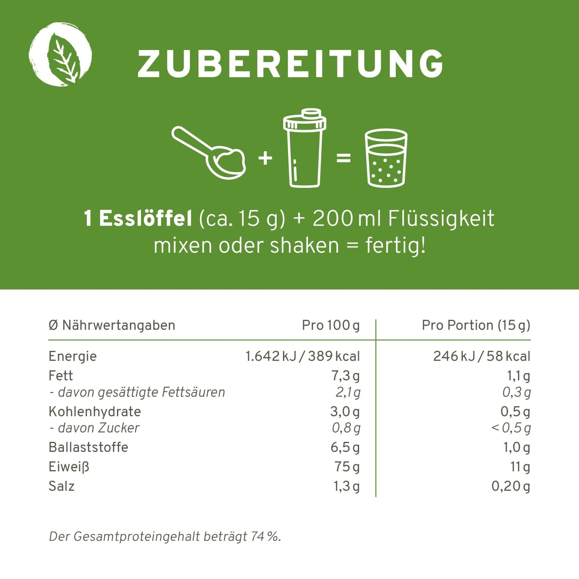 ✔ 74% Proteingehalt und vollständiges Aminosäureprofil durch die wertvolle Kombination von 8 pflanzlichen Proteinquellen: Erbsen, Reis, Sonnenblumenkerne, Kürbiskerne, Hanf, Hafer, Leinsamen und Chiasamen.