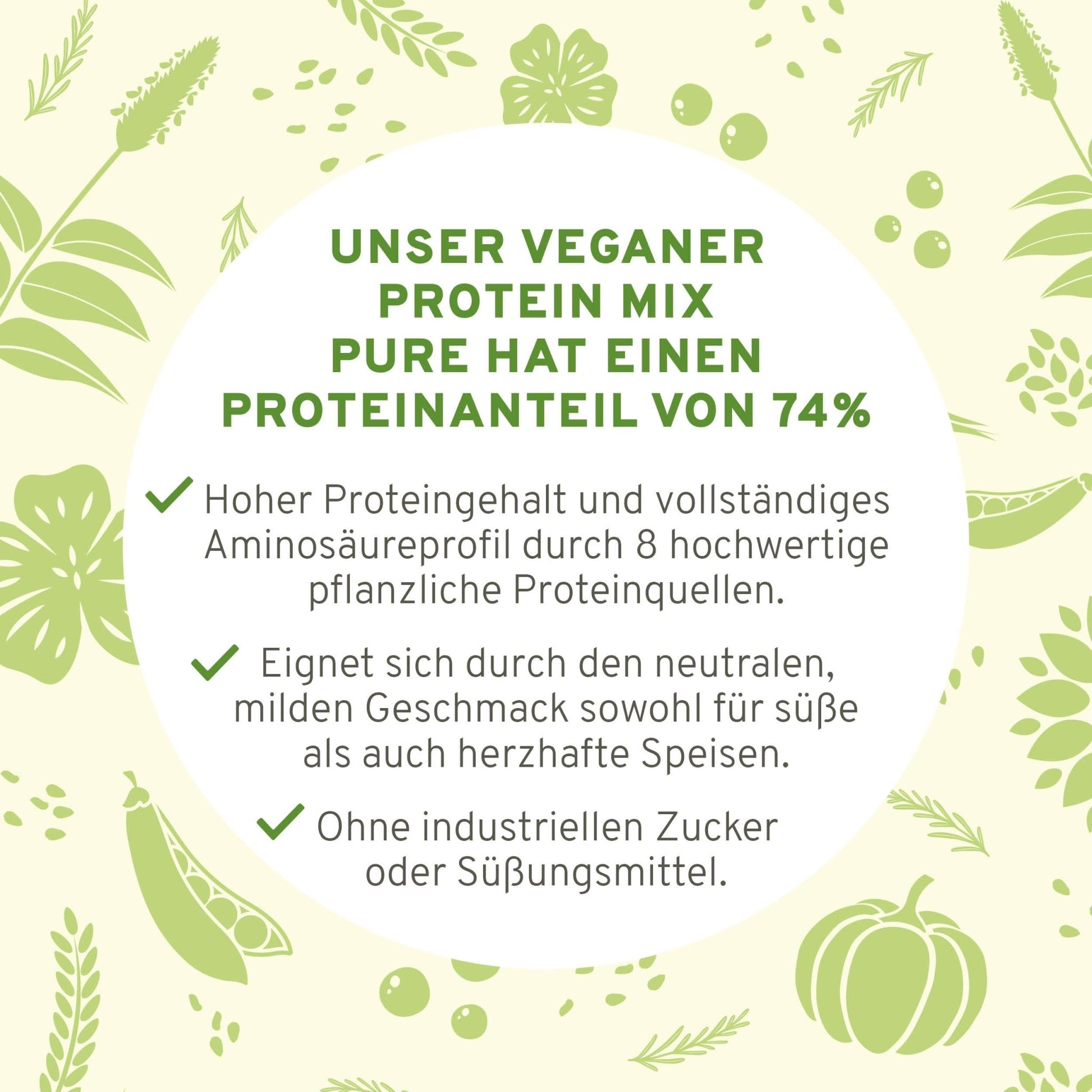 In unserem Veganen Protein Mix Pure sind 8 hochwertige, pflanzliche Proteinquellen enthalten: Erbse, Reis, Sonnenblumenkerne, Kürbiskerne, Hanf, Hafer, Lein- und Chiasamen. Das Besondere an unserem veganen Protein-Mix ist, dass er nicht nur insgesamt 74% Protein enthält und ein vollständiges Aminosäureprofil abdeckt, sondern Dich auch mit weiteren wertvollen Mikro- und Makronährstoffen versorgt.