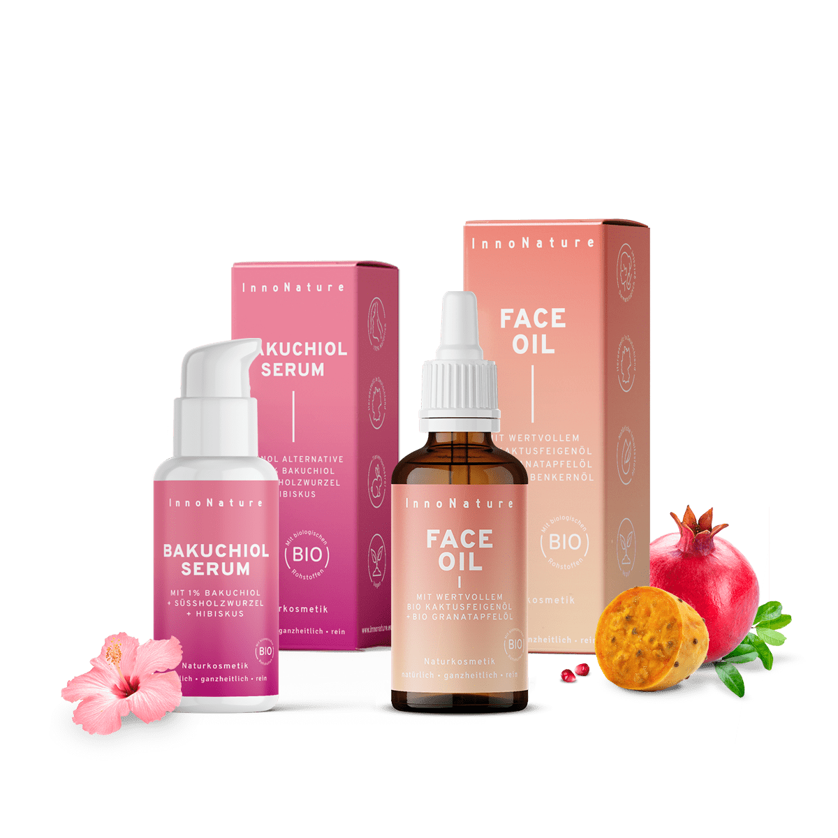 Dieses Set enthält eine hochwirksame Kombination, bestehend aus unserem Bakuchiol Serum und dem Bio Face Oil. Die Produkte bilden das perfekte Team für Deine natürliche Slow Aging Routine.