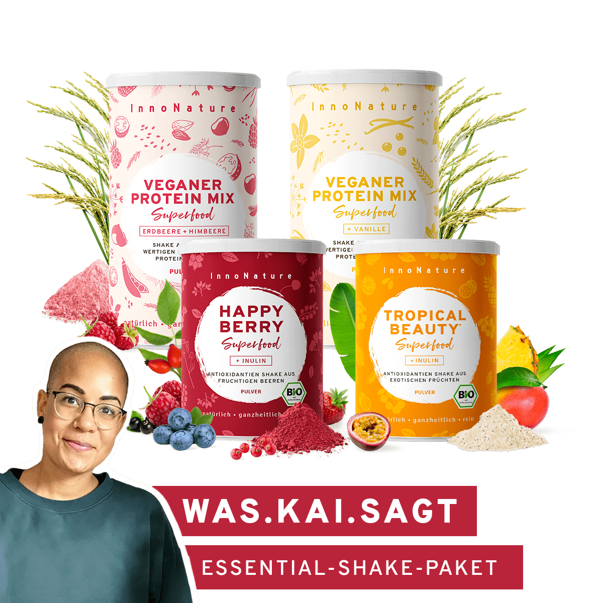 ✔ Unsere Protein Mixe glänzen mit einem vollständigen Aminosäureprofil, da sie bis zu 8 verschiedene pflanzliche Proteinquellen enthalten – darunter Erbsen-, Reis- und Kürbiskernprotein. Unsere Superfood Pulver Happy Berry und Tropical Beauty versorgen Dich mit einer Extraportion Mikronährstoffen, Antioxidantien und sind zudem wahre Ballaststoffwunder.